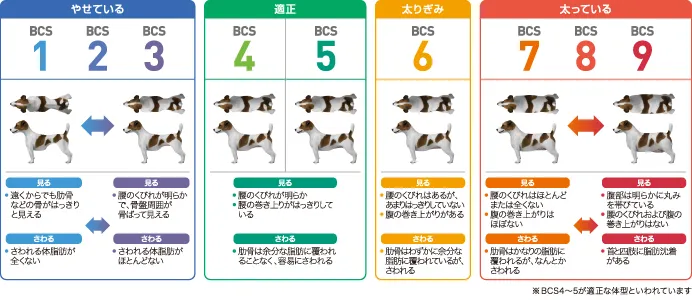 そのため適正体重は一概に「この犬種なら○kg」という決まりはなく、ボディコンディションスコア(BCS)の4~5が適正な体格といわれています。