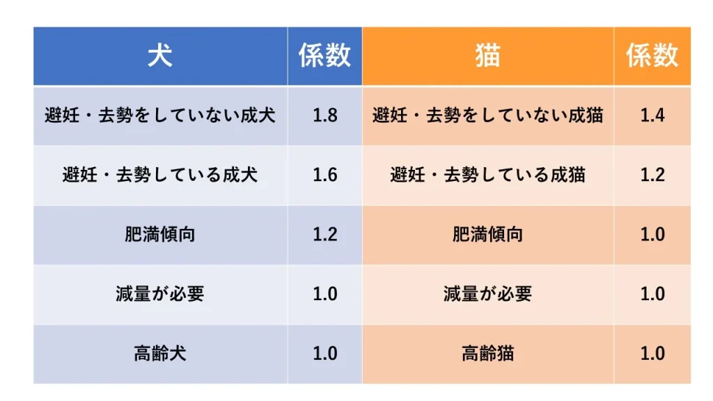 - ③この数値に年齢や運動量などを加味した係数をかけて、1日に必要とするカロリー(1日エネルギー要求量:DER)を算出する