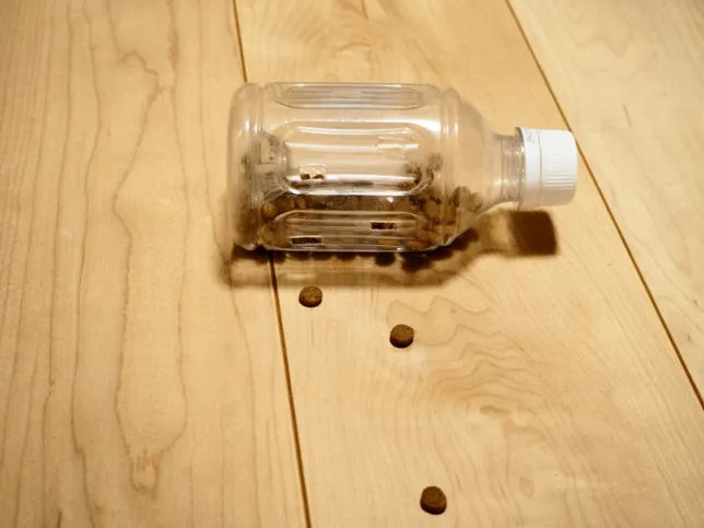 円柱のペットボトルに5mm~1cm程度の穴をあけおやつやドライフードを入れて、遊びながら転がすと1粒ずつでるようなしくみのおもちゃを作り、そのおもちゃでフードをあげることもお勧めです。
