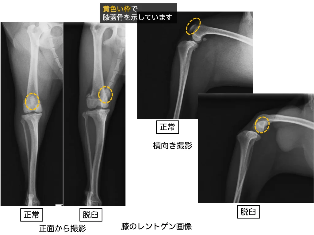 ヒザのお皿である膝蓋骨が内側や外側に外れてしまう病気で、小型犬に多く発症します。