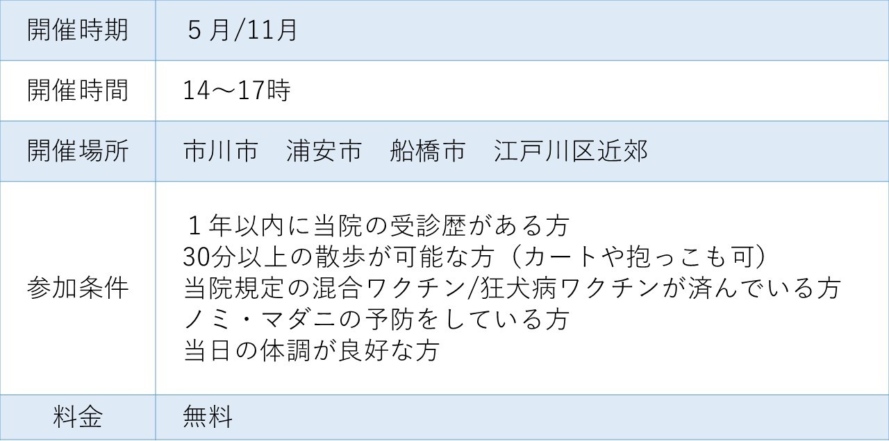 【ALLお散歩会】は初めての方でも気軽にご参加いただける企画です。当院に通いたいけどスタッフのひととなりを知りたい、地元の情報を誰かに聞きたい、得たい方だけでなく、犬友が欲しい、いろんな犬と散歩に行ってみたいという方にもおすすめです。