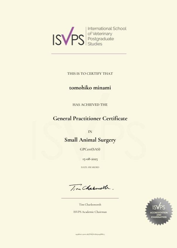このたび新鎌ケ谷の南院長が国際的な獣医師教育機関であるISVPSが認定するGPS(小動物外科認定資格)を取得いたしました!
