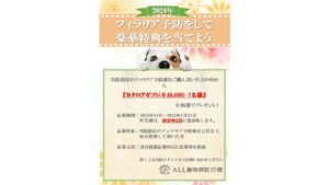 2024春 HWキャンペーンポスター(仮) 2024年2月27日 記事一覧に戻る お勧めの記事 犬や猫の献血にご協力ください ~安全な献血を行うための当院の取り組みをご紹介します~ 2025/11/10 【獣医師が解説】猫の悪性腫瘍の中でも多い「猫のリンパ腫」 2025/11/03 年末年始の診療/ホテルのご案内 2025/11/01 歯科キャンペーンを本年度も開催いたします! 2025/10/27 前の記事 カテゴリ ALL動物病院news (261) 犬 (27) ペットとの暮らし (25) 豆知識 (26) 猫 (30) 動物病院の裏側 (59) シニア (19) パピー/キトン (29) イベント (30) 薬局 (7) お手入れ (19) 食事とダイエット (7) しつけ (25) 献血 (4) ペットホテル (9) 予防 (15) トリミング (17) お知らせ (165) 病気の話 (169) 歯科 (7) 皮膚科 (26) 泌尿器科 (18) 循環器科 (21) 眼科 (14) 外科 (45) 内科 (37) 消化器 (39) ガン (15) 救命救急 (29) 呼吸器 (15) 神経 (10) 生殖器 (9) 内分泌 (5) 血液内科 (13) 感染症 (23) リハビリ (10) 臨床検査室 (30)