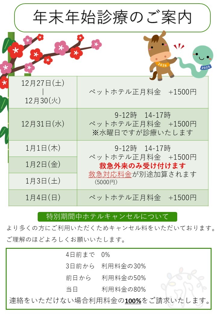秋も深まりだいぶ過ごしやすくなり、お散歩も気持ちいい季節になりました。季節の変わり目には人も動物も体調を崩すことが多いので、健康管理に注意して過ごして いきしょう! 年末年始の診療、ホテルの特定期間についてご案内いたします。 通常の診療時間、料金と異なりますので、ご案内をご確認いただけますようお願いいたします。 この期間中のホテルは混雑が予想されますので、早めのご予約をお勧めいたします。 より多くの方にご利用いただくため、キャンセル料をいただいておりますのでご了承くださいませ。 1月1日~1月3日は救急外来のみの対応となりますのでご注意ください。 ご不便をお掛けいたしますが、ご理解のほどよろしくお願いいたします。