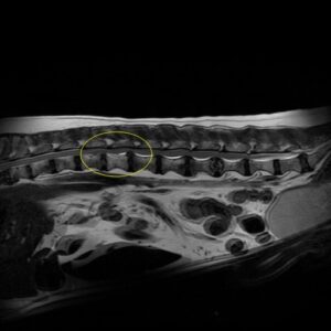 線維輪の性質が変わり、脊髄を圧迫することで発症し、数か月から数年かけて進行していきます。すべての犬種で認められ、中高齢での発症が多く、腰仙部(腰と尾の背骨の間)で見られることが多いです。