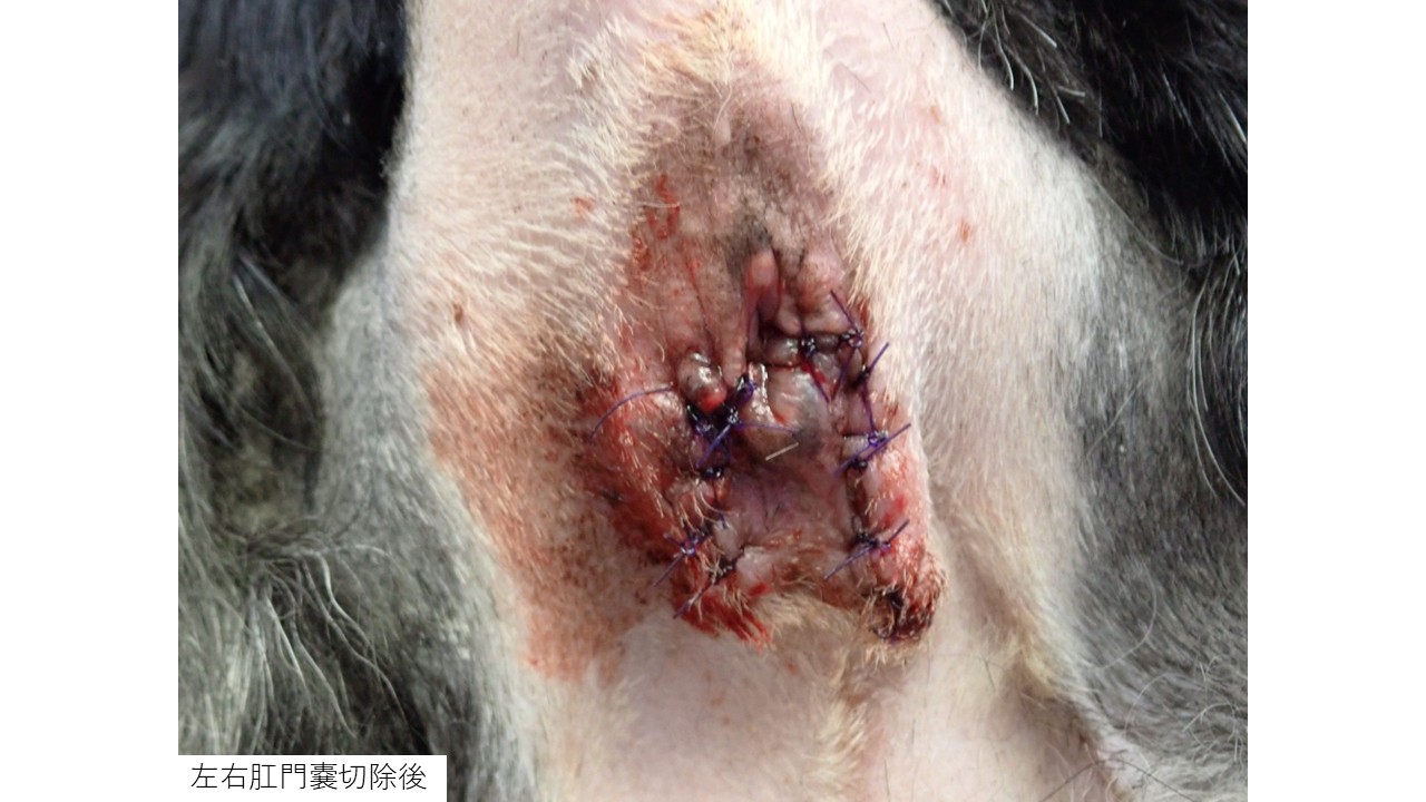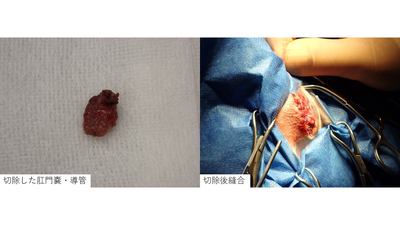 アポクリン腺癌は悪性腫瘍であるため病理組織検査および治療として左右肛門嚢の切除術をおこなった。事前の全身検査では明らかな転移は認められなかった。