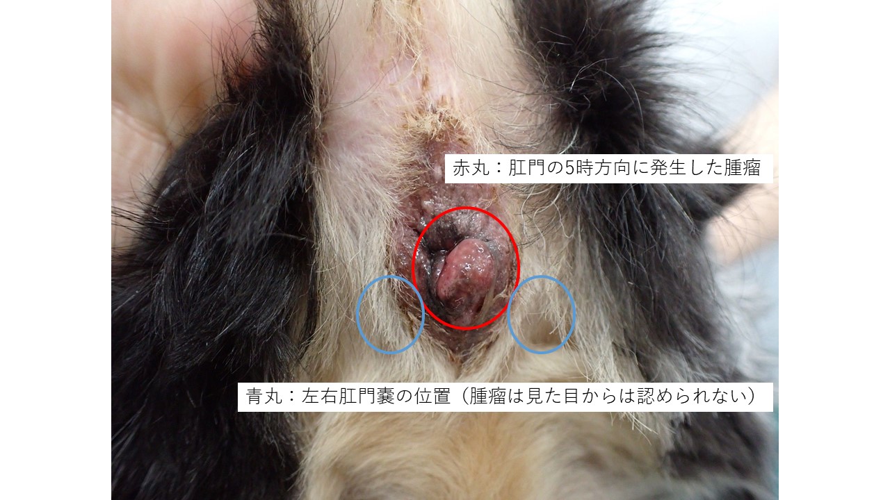 同時に右肛門嚢に5mm大、左肛門嚢に2mm大の腫瘤が触知された