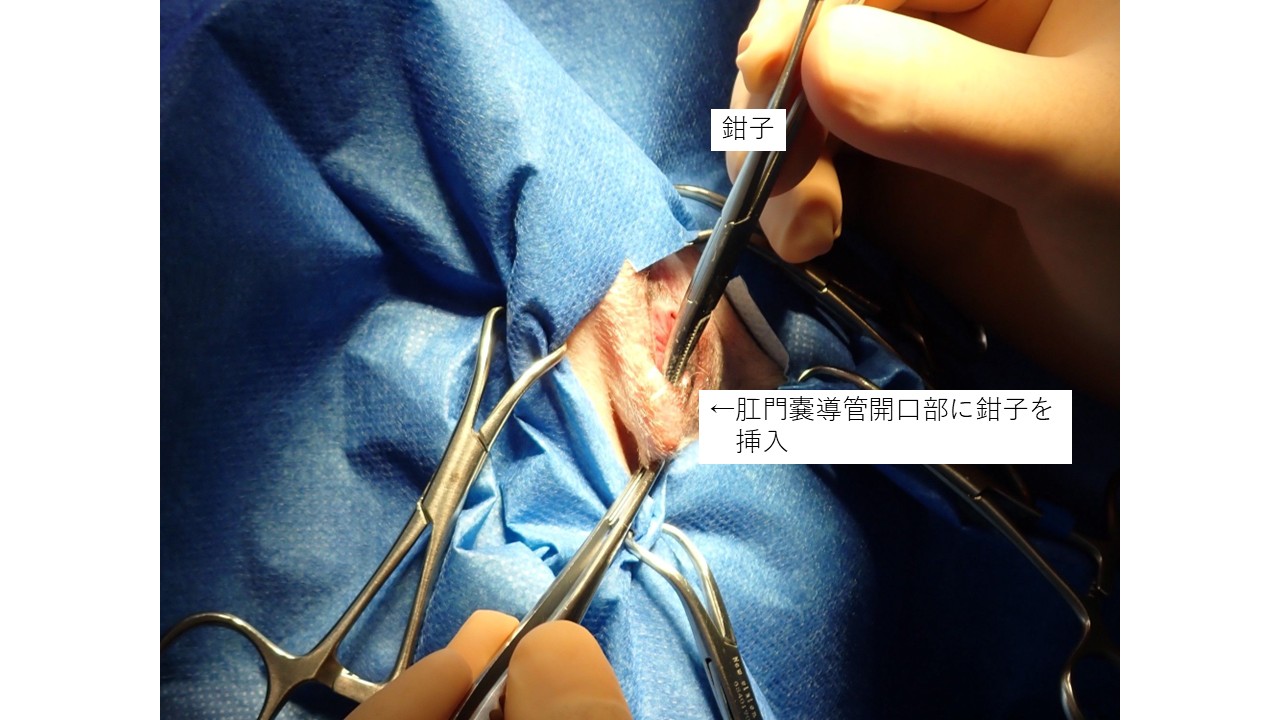 2.肛門嚢の入り口に鉗子を入れ、皮膚・粘膜を切開。